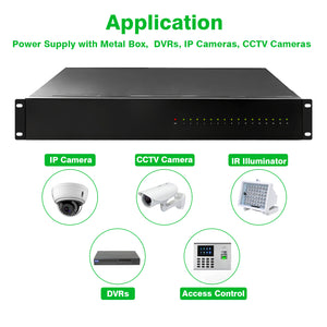 Professional-grade 2U rackmount power supply engineered for distributed CCTV systems. Delivers stable DC 12V output at 20A across 16 independent channels, ensuring reliable power distribution to multiple cameras simultaneously. Integrated UPS maintains continuous operation during power interruptions, while PTC (Positive Temperature Coefficient) protection safeguards each channel against overcurrent and short-circuit conditions. Compact rackmount design fits seamlessly into standard server racks for organized installation. Ideal for surveillance installations requiring redundant power management and channel-level protection.